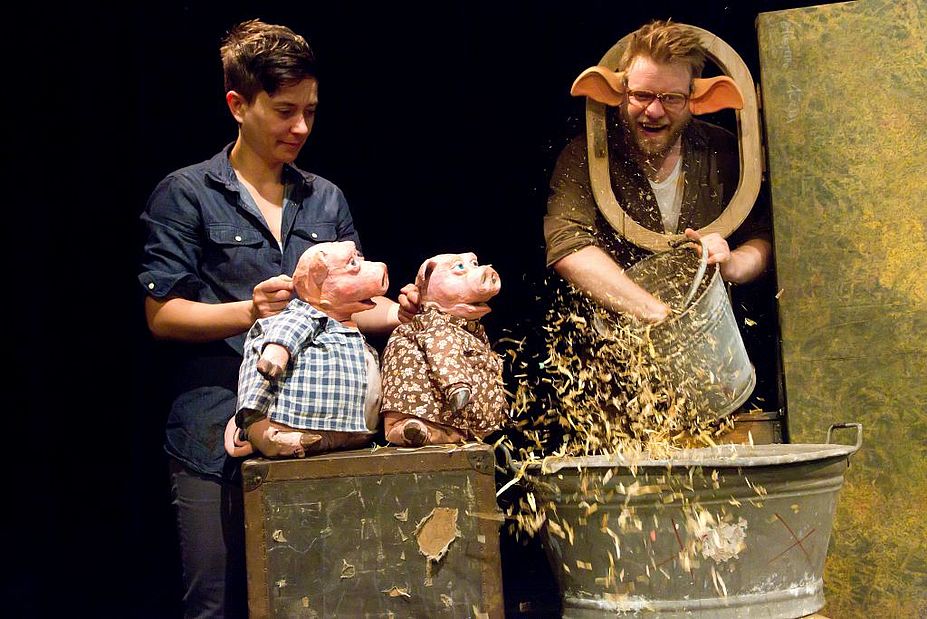 Die drei kleinen Schweinchen interessieren sich nur fürs Fressen, Spielen und Krach machen. Bis die Eltern sie aus dem Haus werfen. Von da an muss der Nachwuchs seine eigenen Wege gehen: Die Geschwister bauen Häuser aus Stroh, aus Holz und aus Stein – und haben dabei nicht an den Wolf gedacht.